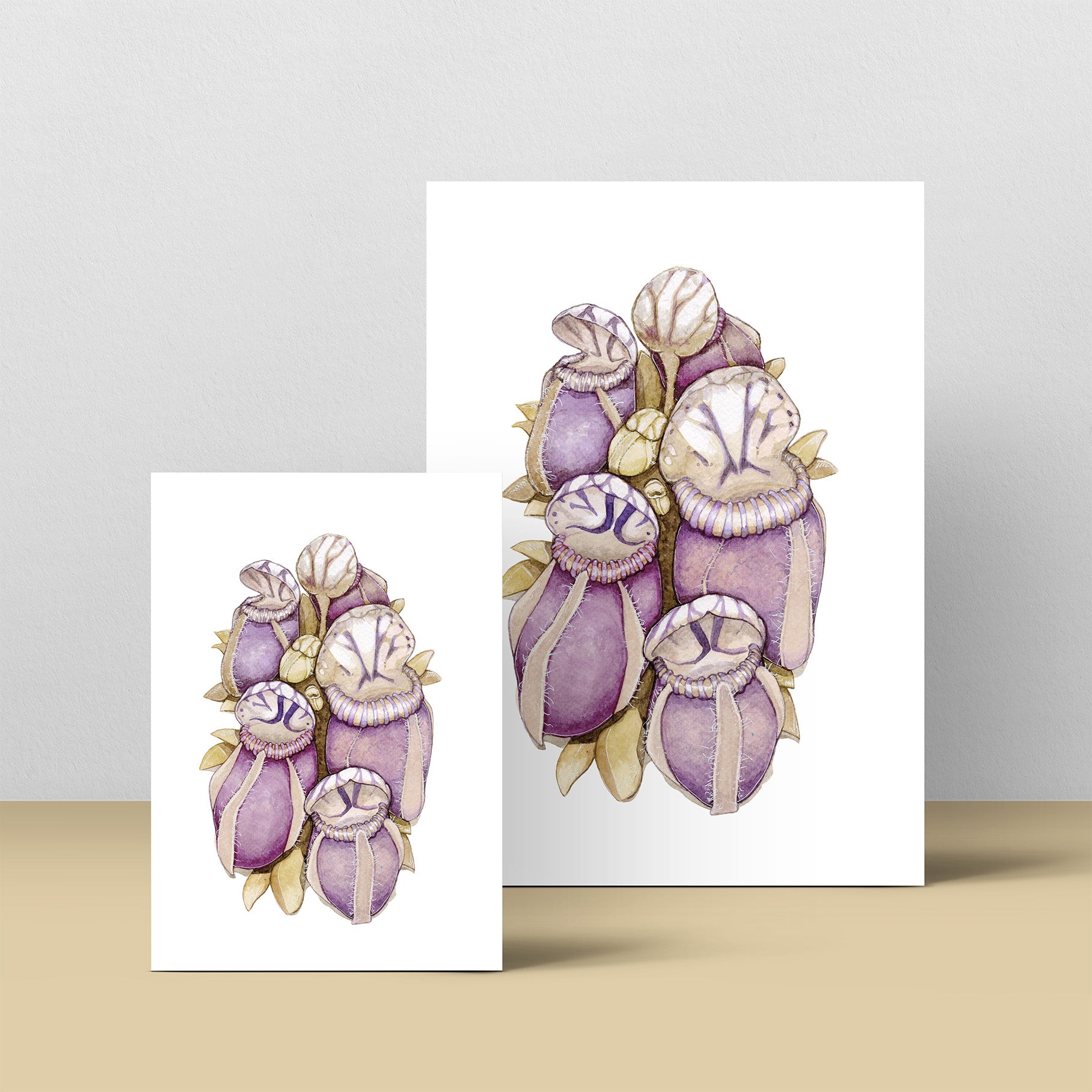 A bold illustration inspired by Cephalotus follicularis, the distinctive Australian pitcher plant, presented on a clean, plain background to keep the focus on form and detail.